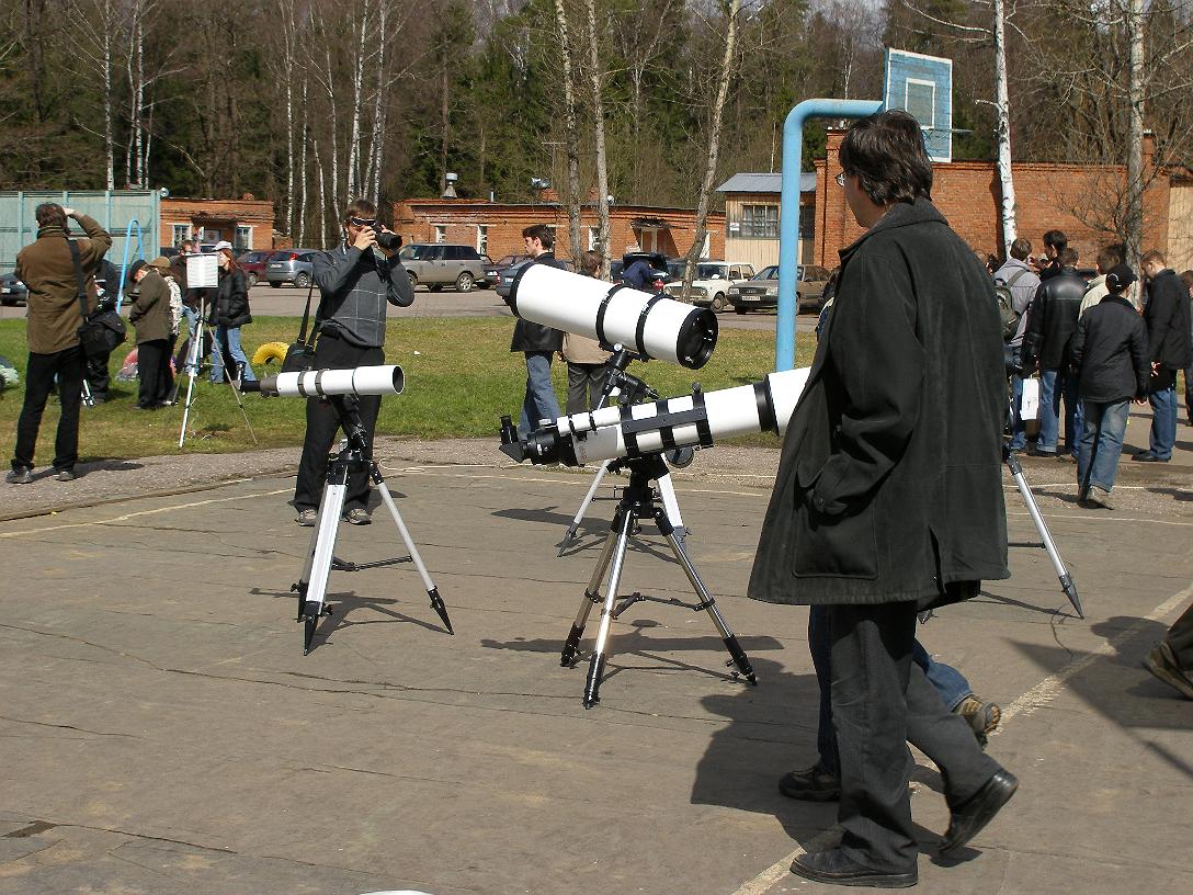 1. На площадке. По случаю хорошей погоды привезённые телескопы